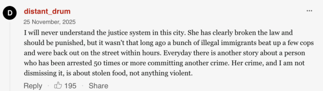 “我永远也搞不懂这座城市的司法系统。她显然违法了,理应受到惩罚,但就在不久前,一群非法移民殴打了几名警察,几个小时后就被放回了街头。每天都有新闻报道,有人被捕五十次以上,却再次犯罪。