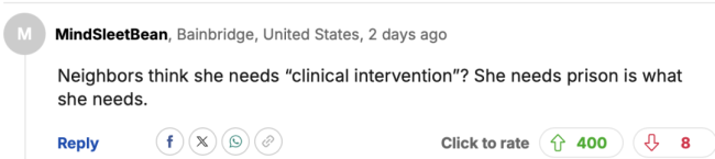“邻居们认为她需要‘临床干预’?她需要的是坐牢。😂😂”