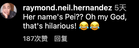 “她叫Pei(和支付Pay同音)?我的天哪,太搞笑了!😂😂”