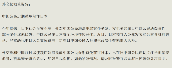 近段时间以来,日本社会治安不靖,针对中国公民的违法犯罪案件多发,治安形势和留学环境不佳,在日中国公民的安全风险上升。教育部提醒已在日和近期拟赴日留学人员密切关注当地治安形势,加强风险评估,切实增强防范意识。建议中国公民谨慎规划赴日留学安排。