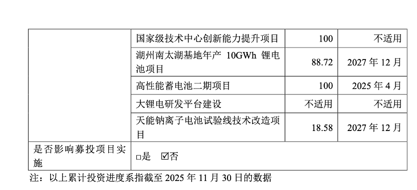 截至2025年11月30日,天能股份首次公开发行募集资金已按计划投入使用。其中,补充流动资金、年产912万KVAh铅酸蓄电池技术装备升级改造、高能动力锂电池电芯及PACK、大容量高可靠性起动启停电池建设、国家级技术中心创新能力提升及高性能蓄电池二期项目均已全部或超额完成投资。绿色智能制造技术改造建设、全面数字化支撑平台建设、湖州南太湖基地年产10GWh锂电池以及天能钠离子电池试验线技术改造等项目仍在持续推进中,当前投资进度分别为65.74%、57.4%、88.72%及18.58%。