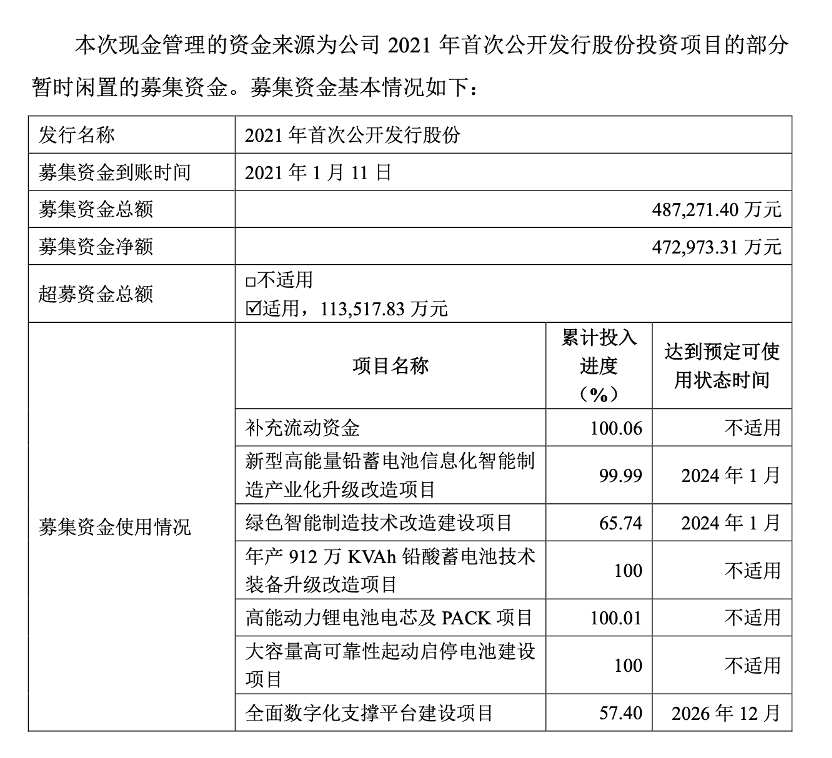 同日(1月8日),天能股份亦公告将合理利用暂时闲置的募集资金。在保障募投项目正常实施与资金安全的基础上,公司及子公司拟使用最高不超过人民币3亿元的闲置募集资金进行现金管理,投资于结构性存款、协定存款、定期存款、大额存单等安全性高、流动性好的产品。该部分资金使用期限同样为12个月,且明确规定不得用于质押或证券投资。