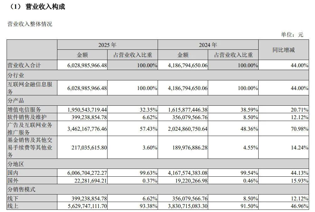 年报披露,报告期内,同花顺收入主要来源于增值电信服务、软件销售及技术维护服务、广告及互联网推广服务以及基金代销及其他交易服务。