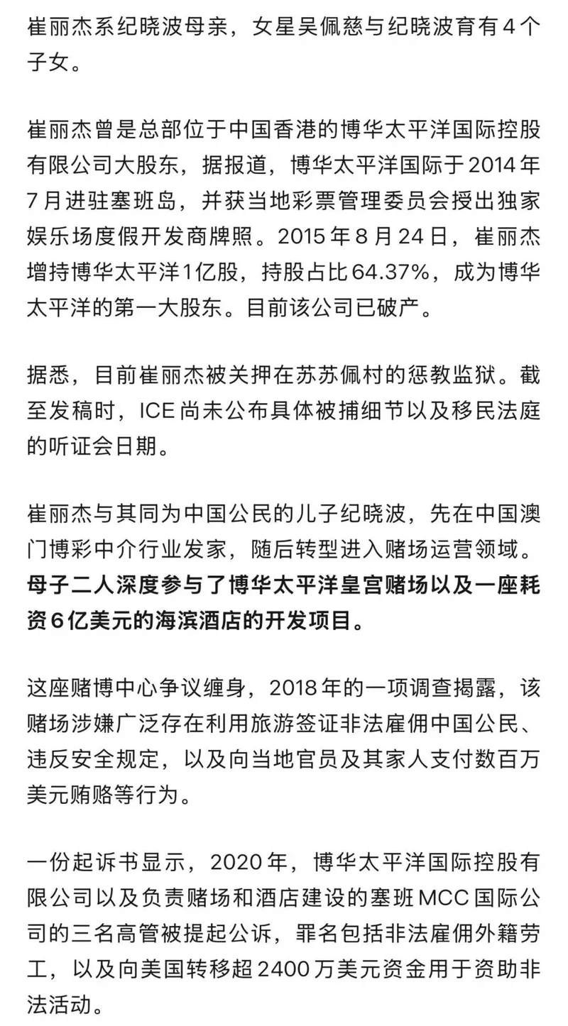 据红星新闻此前报道,美国移民与海关执法局(ICE)逮捕中国公民崔丽杰,据报道,她是西太平洋塞班岛一家豪华赌场的核心操盘者。