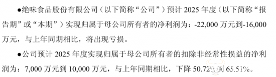 从利润端来看,其2025年归母净利润预计为-2.20亿元到-1.60亿元,同比由盈转亏,而这也是绝味食品自2017年上市以来的首次年度亏损,创历史新低。