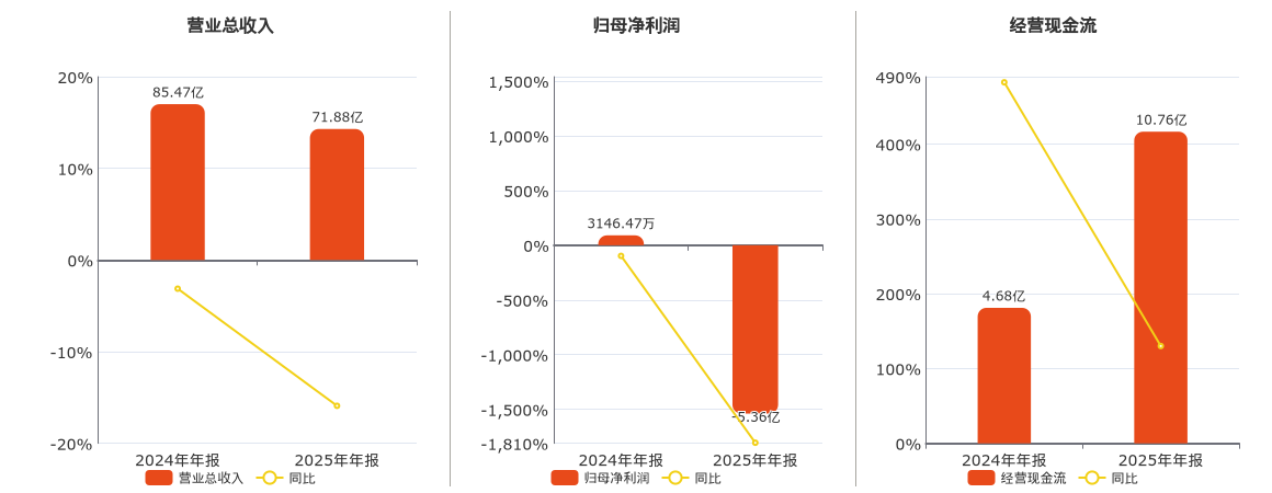 公司营业总收入为71.88亿元,较去年同报告期营业总收入减少13.60亿元,同比较去年同期下降15.91%。归母净利润为-5.36亿元,较去年同报告期归母净利润减少5.68亿元,同比较去年同期下降1804.79%。经营活动现金净流入为10.76亿元。