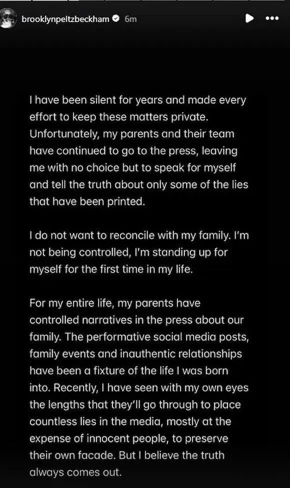 在多达6页的长篇推文里,布鲁克林控诉父母长期“操控”他的生活,多次试图破坏他和妻子妮可拉·佩尔茨的婚姻。还详细列举了引发矛盾的一系列冲突细节,并信誓旦旦地表示“不想跟家人和解”!