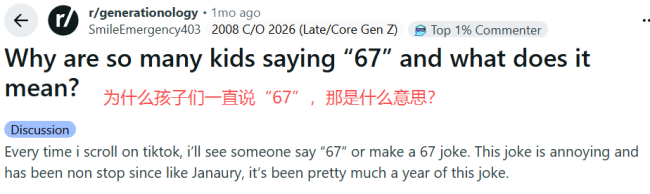 一些比较年轻的Tik Tok用户也不知道“67”是什么意思。(图片来源:Reddit)