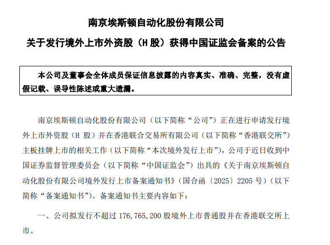 近日,埃斯顿公告称,公司收到中国证监会出具的《关于南京埃斯顿自动化股份有限公司境外发行上市备案通知书》。根据通知书内容,埃斯顿拟发行不超过 176,765,200 股境外上市普通股并在香港联交所上市。