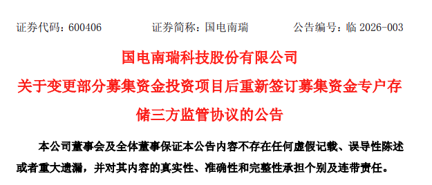 1月24日,国电南瑞科技股份有限公司关于变更部分募集资金投资项目后重新签订募集资金专户存储三方监管协议的公告。