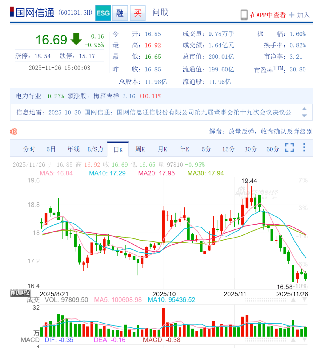 11月26日,国网信通(国网信息通信股份有限公司)收盘市值为200亿元。2025年前三季度,国网信通营业总收入56.87亿元,同比上升5.98%,归母净利润3.51亿元,同比下降8.62%。