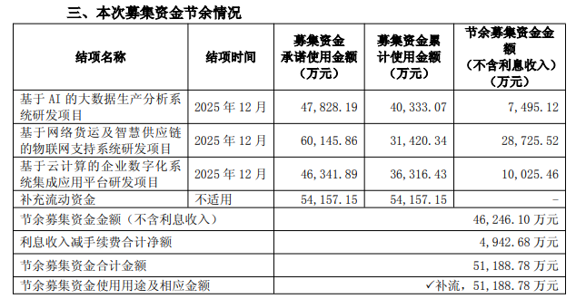 上述募投项目节余募集资金预计共计51,188.78万元(节余金额包含银行利息收入扣除手续费后净额4,942.68万元,实际金额以资金转出当日专户情况为准)。本次拟结项的募集资金投资项目为基于云计算的企业数字化系统集成应用平台研发项目及补充流动资金项目。