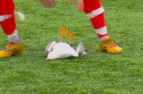 据悉,比赛第22分钟,门将大脚开球时,足球直接命中这只倒霉的海鸥,其当即坠落球场中央,肚子朝上、双腿僵直、呼吸停止。