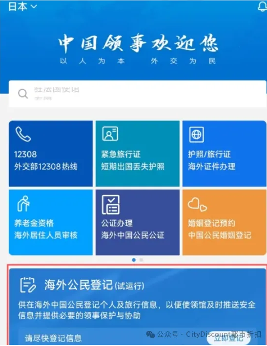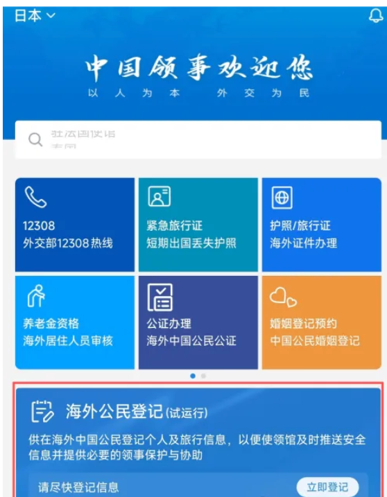 你如果正在日本,那么可以通过下载外交部的 “中国领事” APP ,找到“海外公民登记”模块,按照要求填写你的个人信息。比如电话、住址、身份证 / 护照号码、邮箱、在日旅程安排、家庭成员信息等。