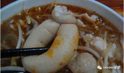 他们还会提示你,肥肠粉的精髓是碗里那根冒节子。这是一种将猪油灌进大肠,两头打结下锅的奇妙食物。