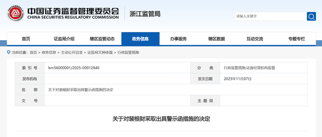 根据《证券公司和证券投资基金管理公司合规管理办法》(证监会令第166号)第三十二条第一款、《证券基金经营机构信息技术管理办法》(证监会令第179号)第五十七条的规定,浙江证监局决定对裴根财采取出具警示函的监督管理措施,并记入证券期货市场诚信档案。