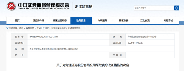 近日,浙江证监局发布《关于对财通证券股份有限公司采取责令改正措施的决定》。