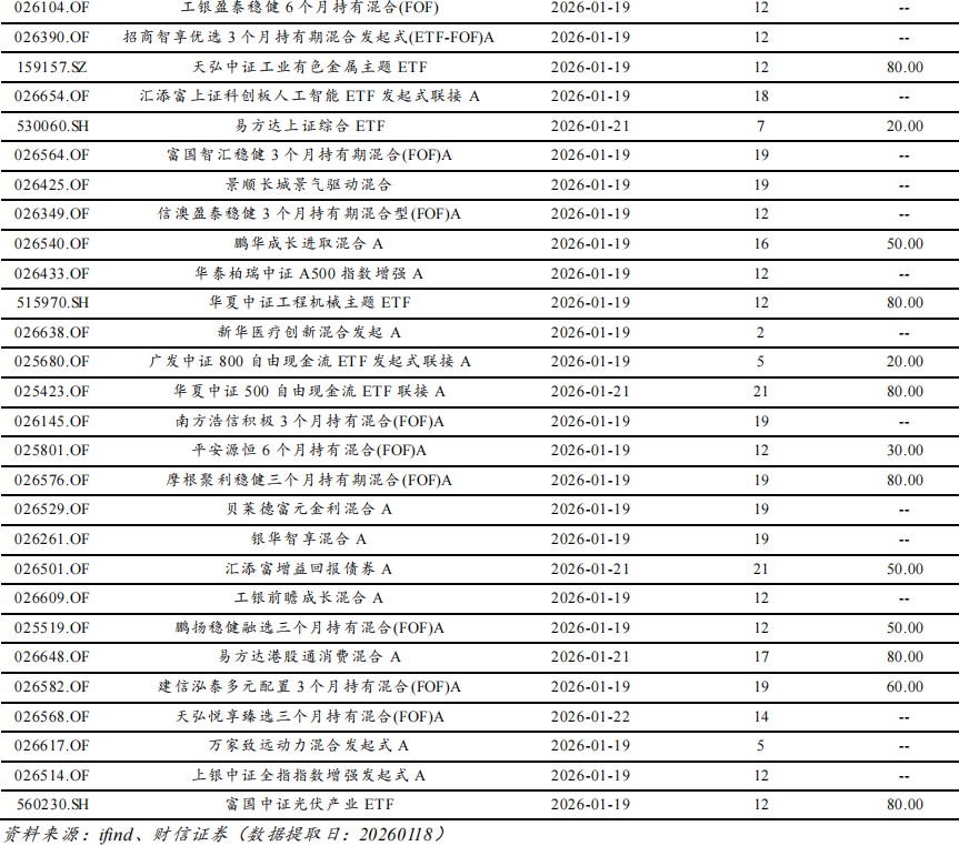 截至目前(0119),全市场共有公募基金13642只,合计资产净值约37.26万亿。根据ifind公布的基金发行明细,本周(0119-0123)约有40只基金新发行。具体分类型看,有8只主动管理型权益类基金、4只固收+基金、12只混合型FOF、13只被动指数型股票基金(涉及港股通医疗、芯片设计、新能源、石油天然气、工程机械等主题)、2只增强指数型股票基金(中证全指、中证A500)、1只中长期纯债券型基金。