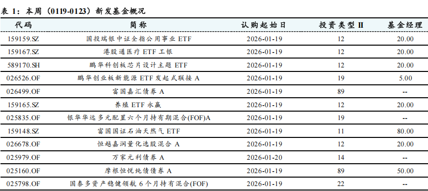 根据ifind公布的基金发行明细,本周(0119-0123)约有40只基金新发行。具体分类型看,有8只主动管理型权益类基金、4只固收+基金、12只混合型FOF(2只偏股、10只偏债)、13只被动指数型股票基金(涉及港股通医疗、芯片设计、新能源、石油天然气、工程机械等主题)、2只增强指数型股票基金(中证全指、中证A500)、1只中长期纯债券型基金。