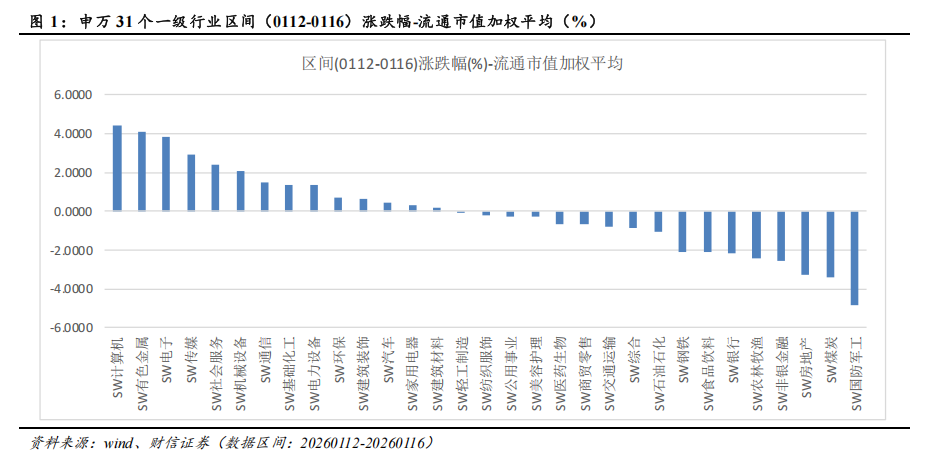 上周(0112-0116)申万31个一级行业涨跌各半,计算机(4.44%)、有色金属(4.12%)、电子(3.81%)等行业周内涨幅居前,国防军工(-4.8%)、煤炭(-3.39%)、房地产(-3.25%)等行业周内收跌。(口径:区间涨跌幅-流通市值加权平均)