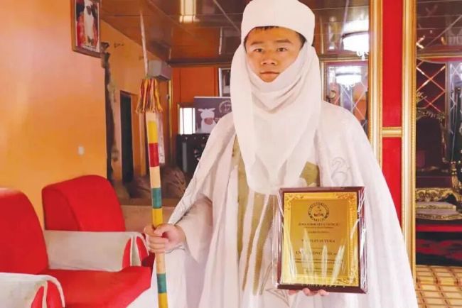 孔涛在加冕仪式上,手持酋长证书和权杖