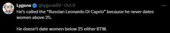 粉丝留言不知真假:(那是因为)俄版的小李子也不和25岁以上的女生约会...