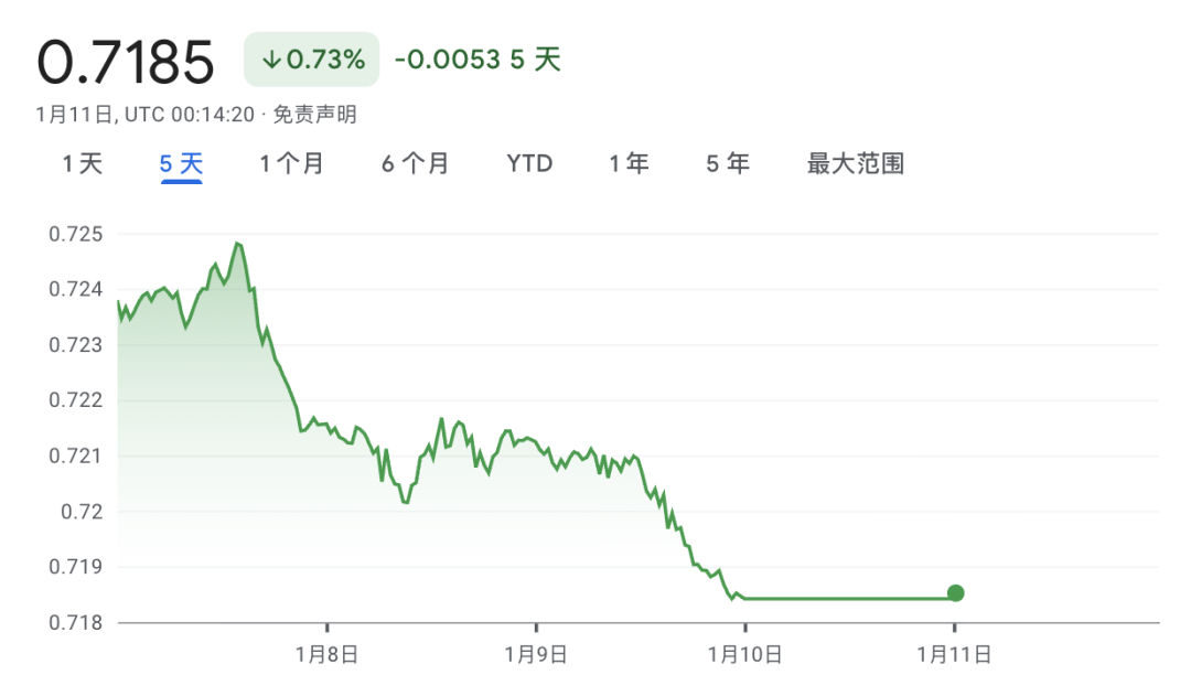 在周中盘中,加元兑美元一度贬至 1 加元兑 1.384 美元左右,也就是每一美元需要约 1.38 加元才能兑换,换算下来相当于 1 加元只值大约 72 美分。