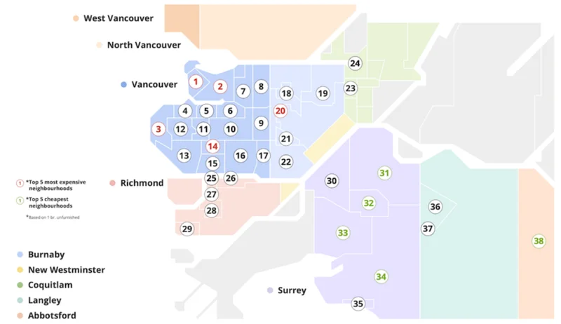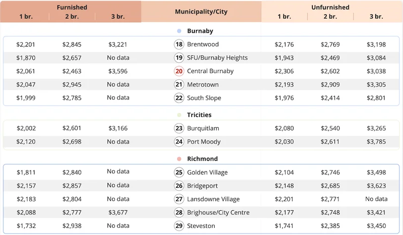 如果你必须留在本拿比,South Slope是目前最便宜的选择,平均1976加元。列治文这边,斯蒂夫斯顿成了价格最低的区域,约1741加元。