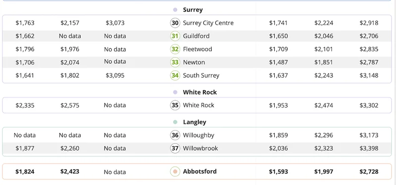 素里其实不只是Newton能打。南素里的一居室平均1637加元,Guildford大约1650加元,Fleetwood区在1709加元左右,市中心也控制在1741加元。在如今的大温,这些数字已经算是“能让人认真考虑”的水平了。