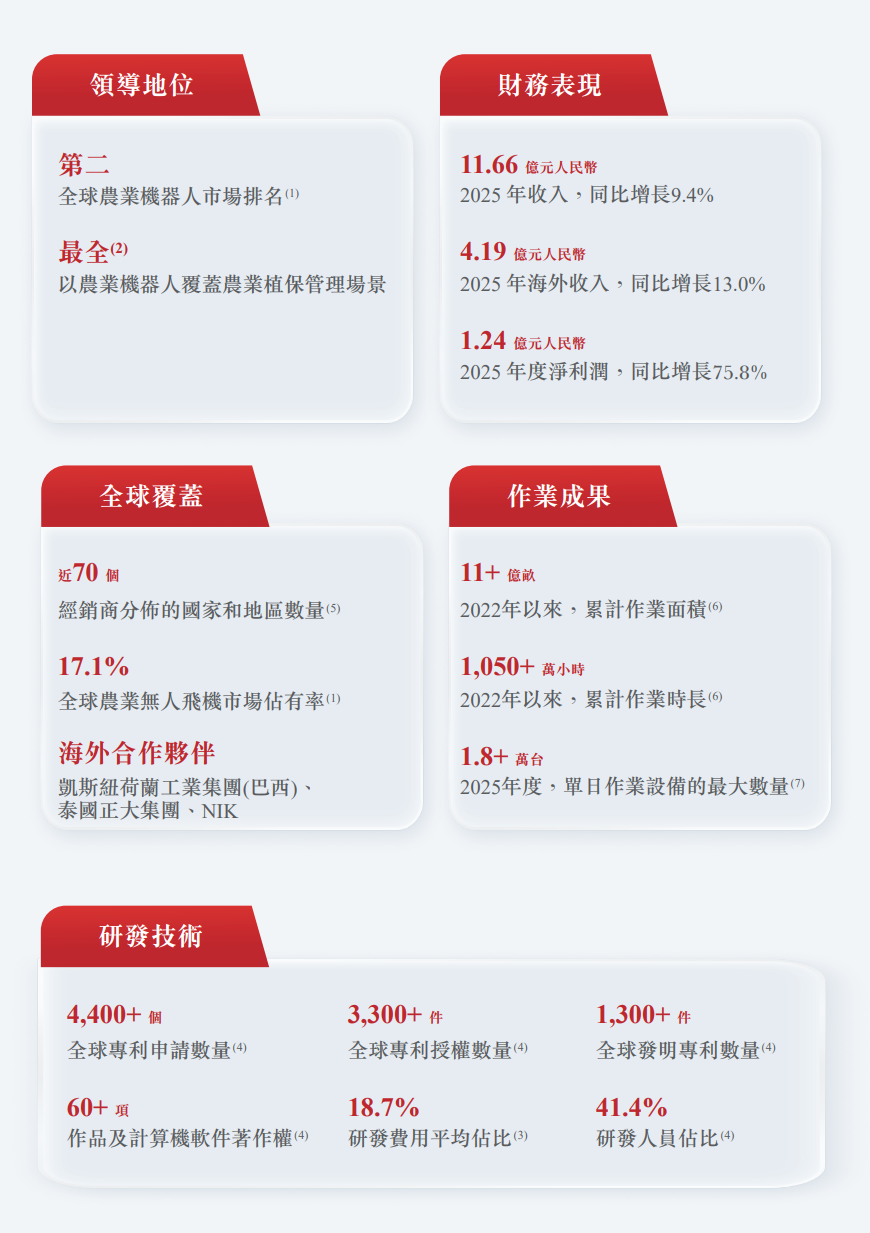 据招股书,极飞科技是一家全球领先的农业机器人公司。根据弗若斯特沙利文的资料,2024年度公司以10.7%和17.1%的市占率于世界农业机器人和农业无人飞机行业分别排名第二。