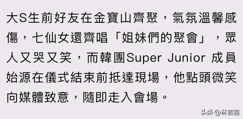 估计当时没有参加葬礼,一周年纪念日被S家邀请了;只能说他与大S小S的关系甚好,毕竟分手了的情侣还能联系的并不多,何况大S前夫汪小菲都没有被邀请。
