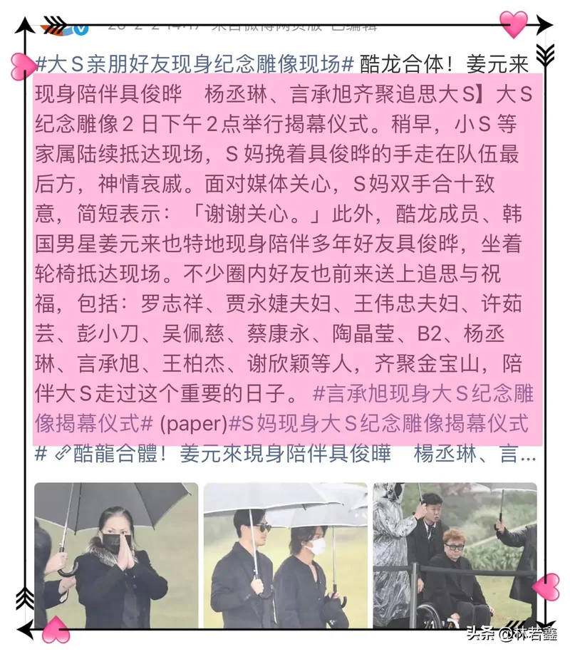 金宝山罕见热闹起来。因为很多明星现身大S雕像揭幕仪式,周渝民和言承旭现身了,一个人大S《流星花园》里的男友,一个是现实生活中的前男友,梦回《流星花园》,吴佩慈也去了,挺不容易的,她婆婆前段时间被捕,这时候出席活动,也是姐妹情深,黑人范玮琪现身是意料之中,又是好姐妹又是前男友,小S一身黑,戴着口罩,许雅钧很贴心,这两次出席都是全程搂着小S,看起来很恩爱!王伟忠夫妇出席也是很正常,那是大S恩师,还有蔡康永,陶晶莹,罗志祥,杨丞琳。这些都是大S的好友,具俊晔这边也有重量级好友现身,崔始源,“酷龙”组合的姜元来,大老远坐轮椅来的。看得出来与具俊晔感情生活!
