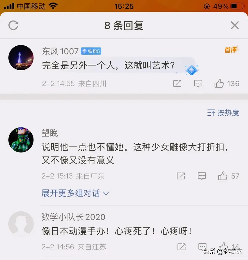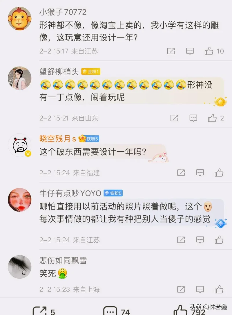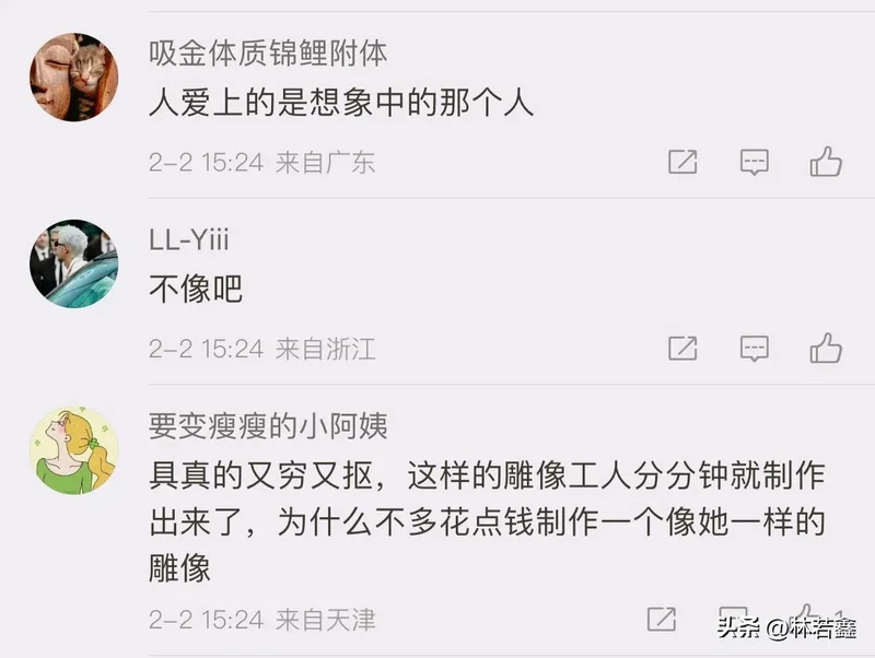雕像揭开以后网友炸锅了,不少纷纷留言:这是谁?完全看不出这是大S,一个中年人整个卡通雕像算什么?更多网友觉得这个雕像看起来像某宝或者某多多买的,完全不需要花费一年的时间!太敷衍了,看着太廉价了,撕碎了大S最后的体面,网友说看看旁边高以翔的电影,看看李纹,周海媚的雕像,这是让祭拜的人完全认不出是谁的雕像?为了省钱吗?可以说太让人失望了,评论区对具俊晔骂声一片