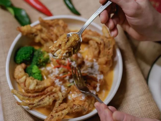 软壳蟹金黄松软搭配秘制咖喱椰浆酱汁
