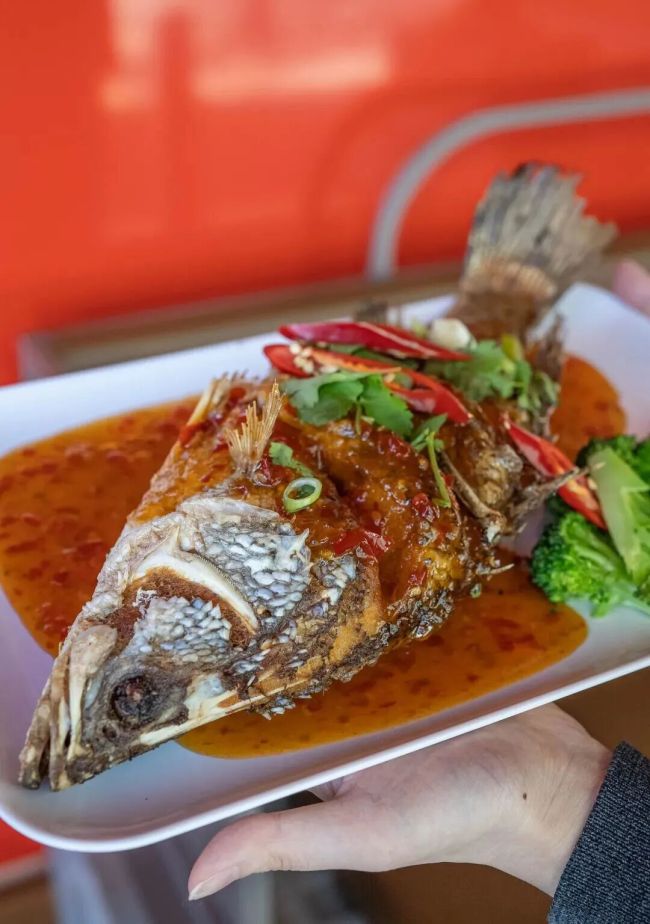 海鱼经过油炸再淋上泰式秘制甜辣酱