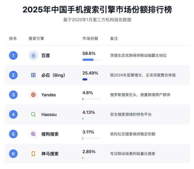 从2016年到2024年,百度在中国搜索市场的份额从超过80%一路下滑,据Statcounter数据显示,2025年百度在中国搜索市场(手机端)虽仍排名第一,但市场份额已经掉到58.6%。