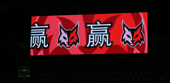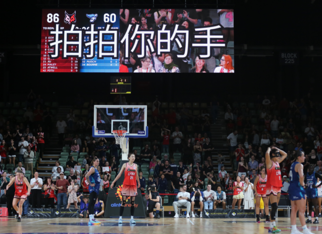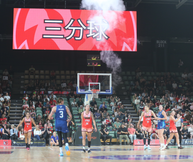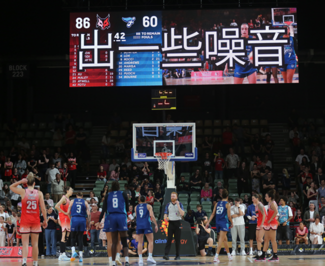 比如,球场的大屏幕上经常会显示中文提示,如“防守”、“三分球”、“拍拍你的手”等。