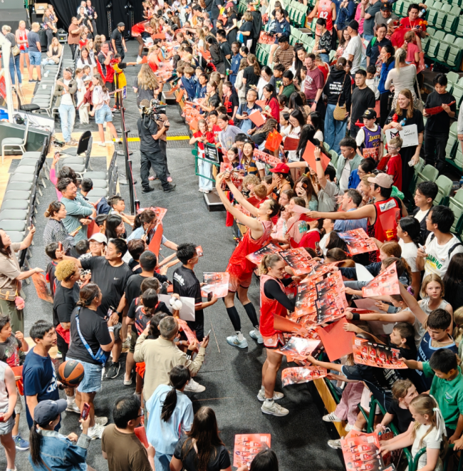 比赛结束后,包括韩旭在内的山猫队员们留在场内与球迷们亲切互动,不论合影还是签名,全都一一满足。