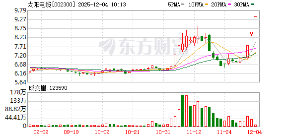 太阳电缆盘中涨停,已连收3个涨停板,截至9:25,该股报9.42元,换手率0.48%,成交量346.46万股,成交金额3263.67万元,涨停板封单金额为3.70亿元。连续涨停期间,该股累计上涨33.24%,累计换手率为13.62%。最新A股总市值达68.04亿元,A股流通市值68.04亿元。