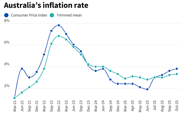 当前通胀走势也显示经济结构正在发生变化。澳洲统计局的最新数据显示,10月月度通胀为0.0%,与9月一致,但由于去年同期为-0.2%,年度通胀率因此升至3.8%。与此同时,剔除燃油等高波动项目的核心通胀也上扬至3.3%。