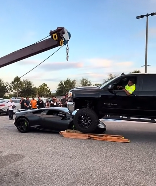重达三吨的皮卡轻松碾过兰博基尼前端,压碎引擎盖、前保险杠、挡风玻璃和车顶,幸运的是位造成人员伤亡。