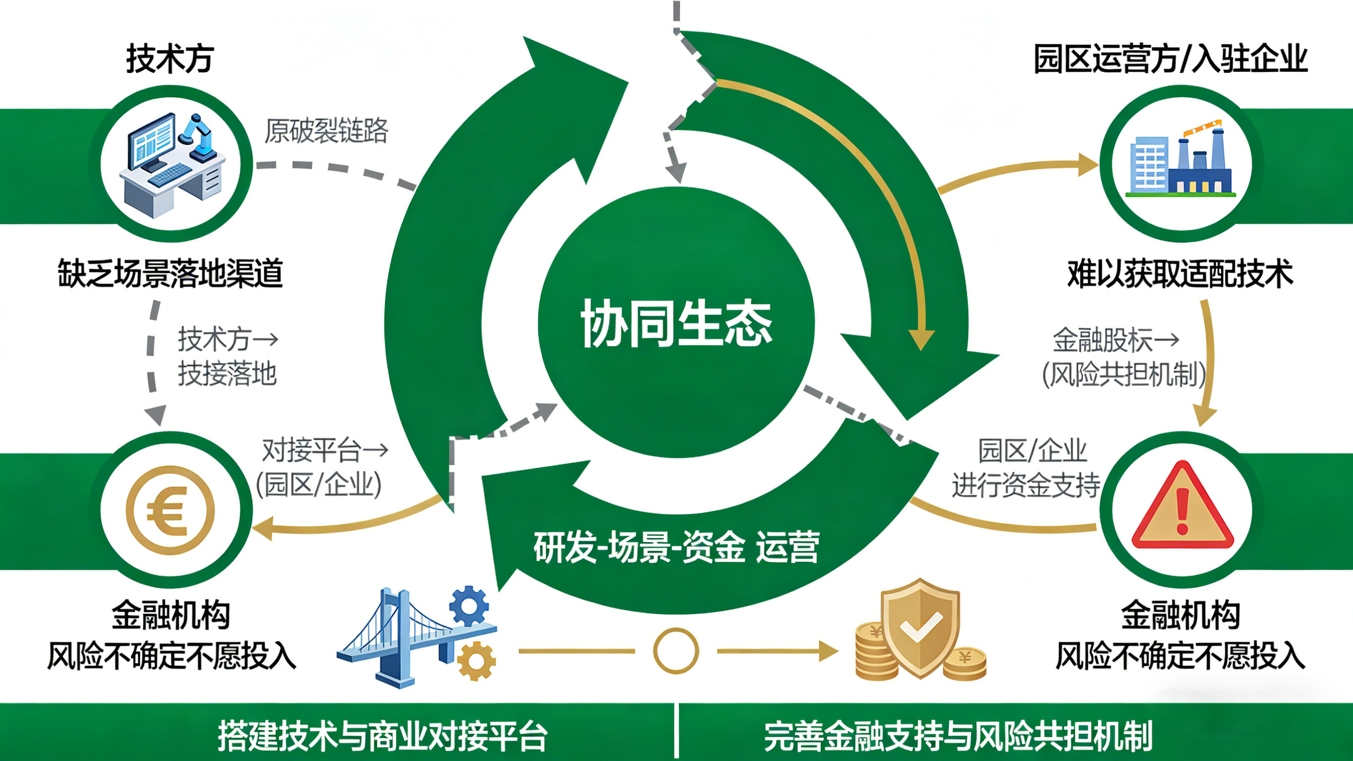 技术方、园区运营方、入驻企业、金融机构等主体的协同不足,导致技术与商业的链路断裂:技术方缺乏场景落地渠道,园区与企业难以获取适配技术,金融机构因风险不确定不愿投入。应对这一问题,需构建“多方联动、优势互补”的协同生态,打通技术研发、场景落地、资金支持、商业运营的全链路。