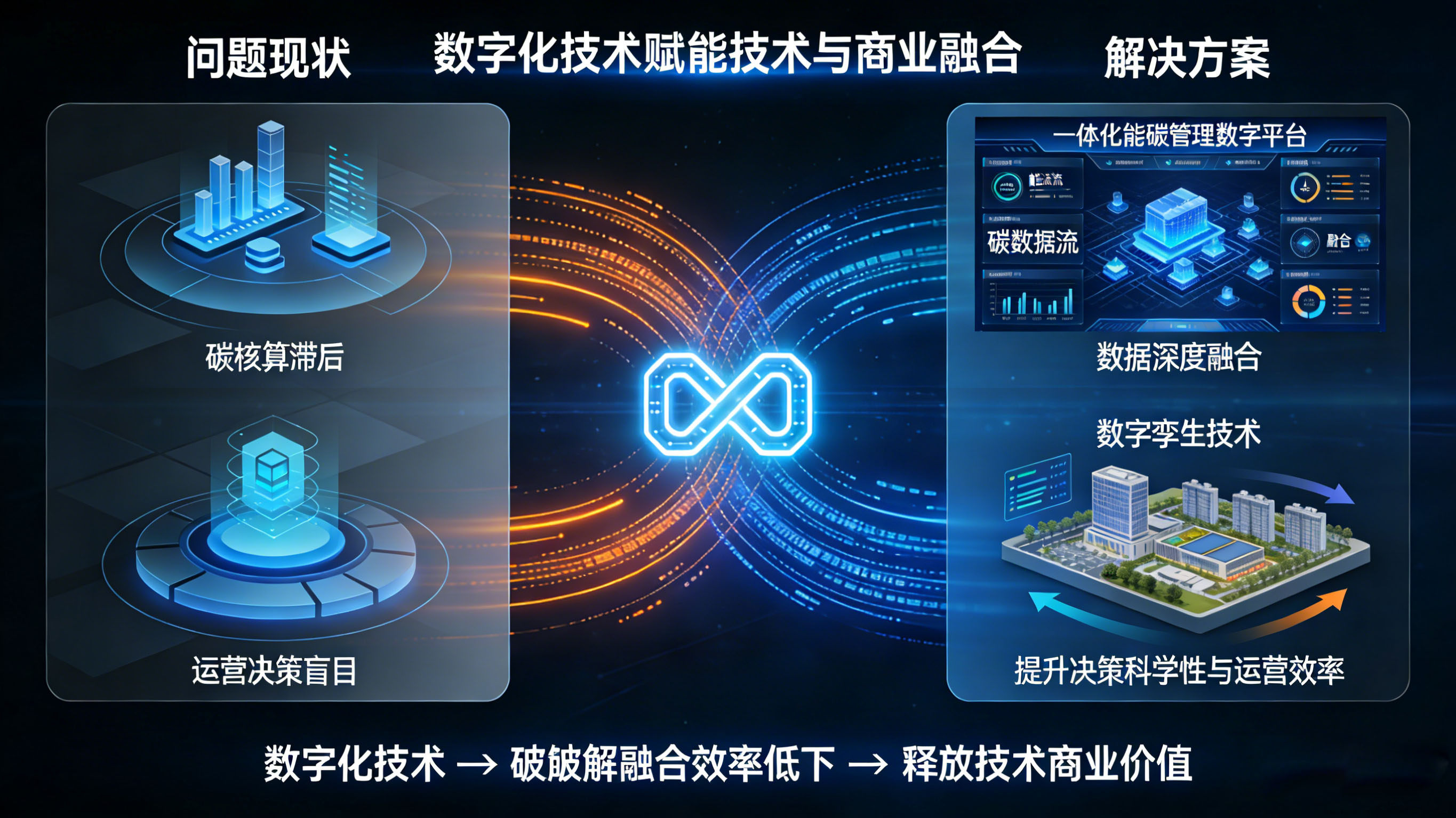 数字化技术是破解技术与商业融合效率低下的关键支撑。当前,多数园区存在技术数据与商业数据割裂、碳核算滞后、运营决策盲目等问题,导致技术的商业价值难以充分释放。应对这一问题,需以数字化技术为纽带,实现技术运行数据与商业运营数据的深度融合,提升决策科学性与运营效率。
