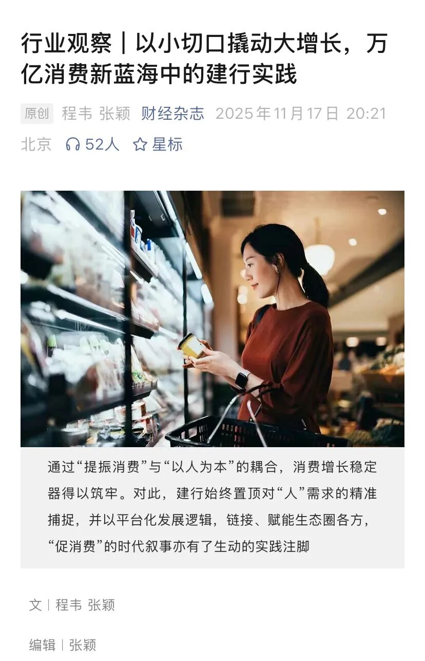这些成绩背后,是建行从需求端激发乘数效应、于流通端畅通血脉循环、在供给端夯实产业根基,共同构筑出的一个系统化、可持续的促消费“新方程”。