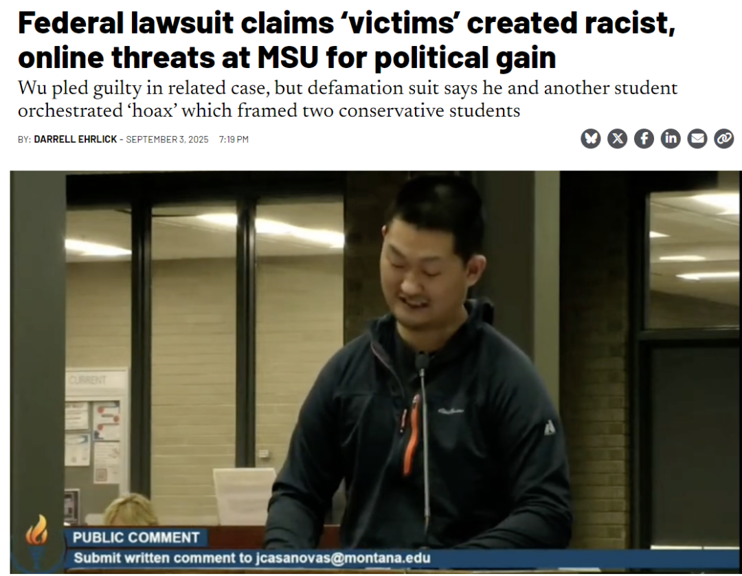 案情显示,在发送这些邮件后不久,吴于2023年3月以“有色人种学生”身份出席蒙大拿州立大学理事会会议,公开声称少数族裔在校园内正遭受攻击,并要求校方说明仇恨犯罪与仇恨事件的应对政策。