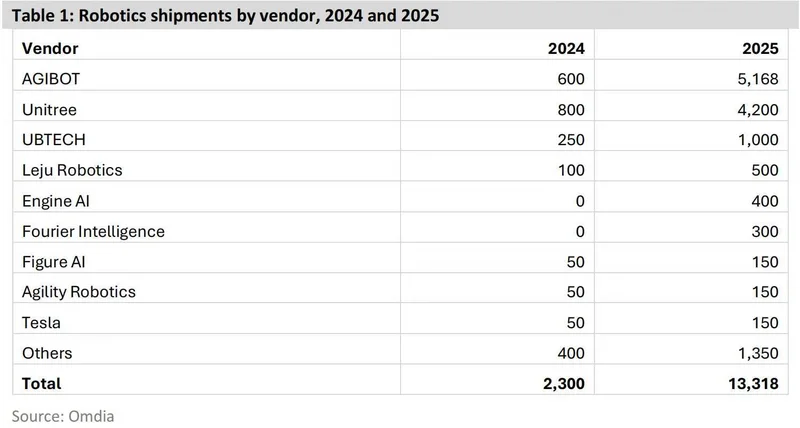 中国厂商同样占主导,榜单露出的前9名均为国内企业,其中智元以5200台的出货量位居榜首,和Omdia数据接近,市场份额为29.4%。