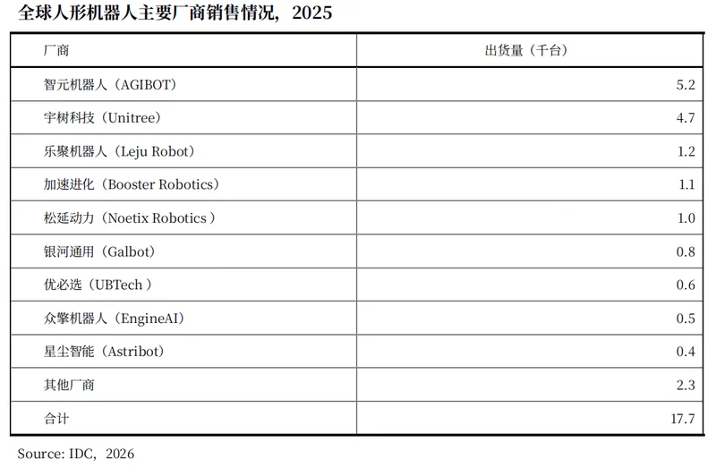 宇树出货量为4700台,高于前述两家机构数据,市占率近26.6%,位于第二。优必选则在IDC榜单中的排名下降到第七,出货量为600台,市占率仅3.4%。