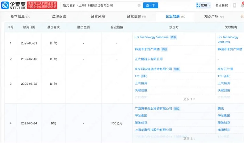 2025年3月,在A轮阶段徘徊一年半、融资六次的智元,终于迈入B轮融资,由腾讯领投,投后估值150亿元。半年内,智元连续完成四次B轮融资,成为和宇树一样行业里的第一梯队。