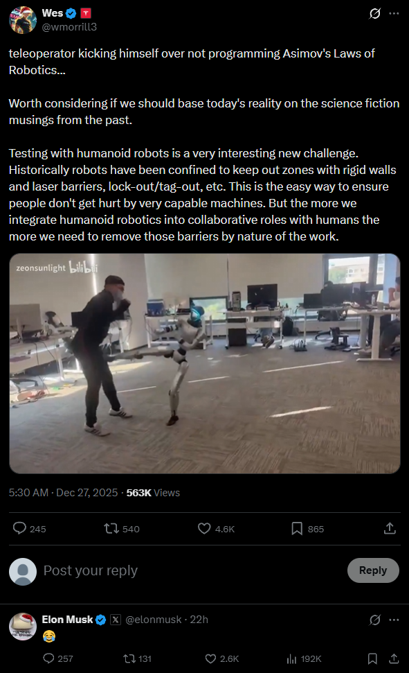 快科技12月28日消息,据媒体报道,日前,特斯拉Cybertruck首席工程师在X平台转发了一段宇树科技G1人形机器人进行同步模拟动作测试的视频,引发网友关注。