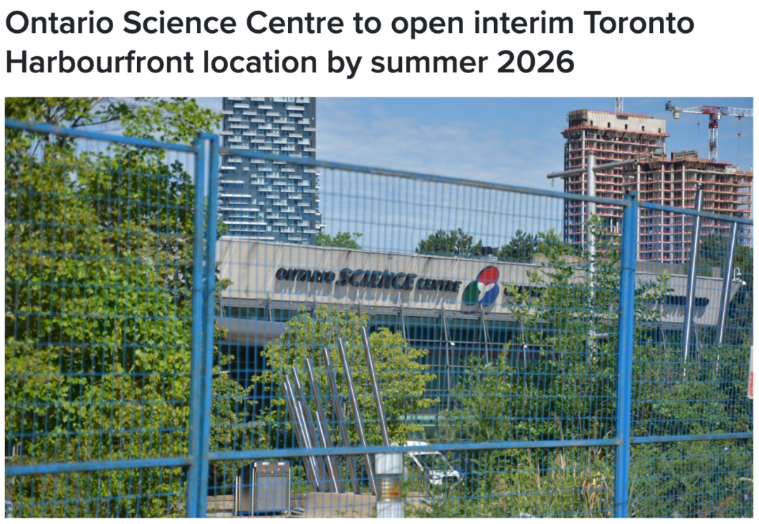安省政府刚刚宣布,位于原唐密尔斯(Don Mills)旧址的安大略科学中心(Ontario Science Centre)将在 2026 年夏季于多伦多湖滨中心 (Harbourfront Centre)启动全新临时馆址。